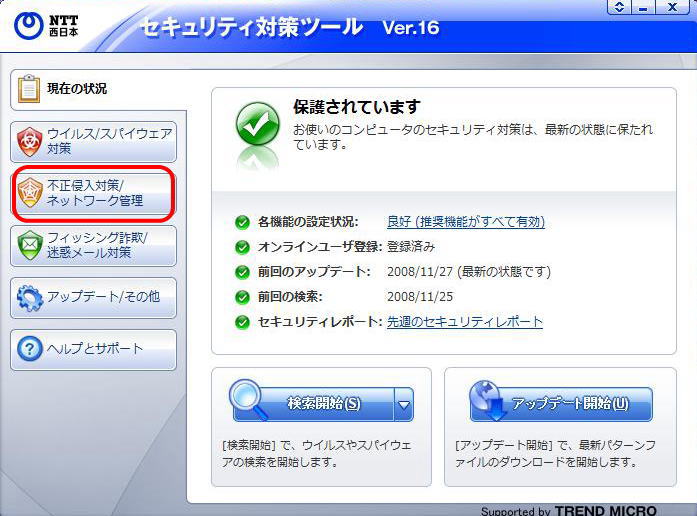 メイン画面の左メニューにある「不正侵入対策/ネットワーク管理」をクリック。 |