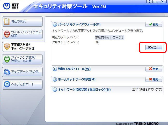 右画面に表示されたカテゴリの中から、「パーソナルファイアウォール」→「設定」の順にクリック。 |