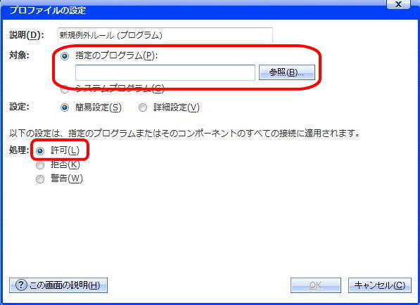 「パーソナルファイアウォール」の設定画面から、「プロファイルの変更」をクリック。 |